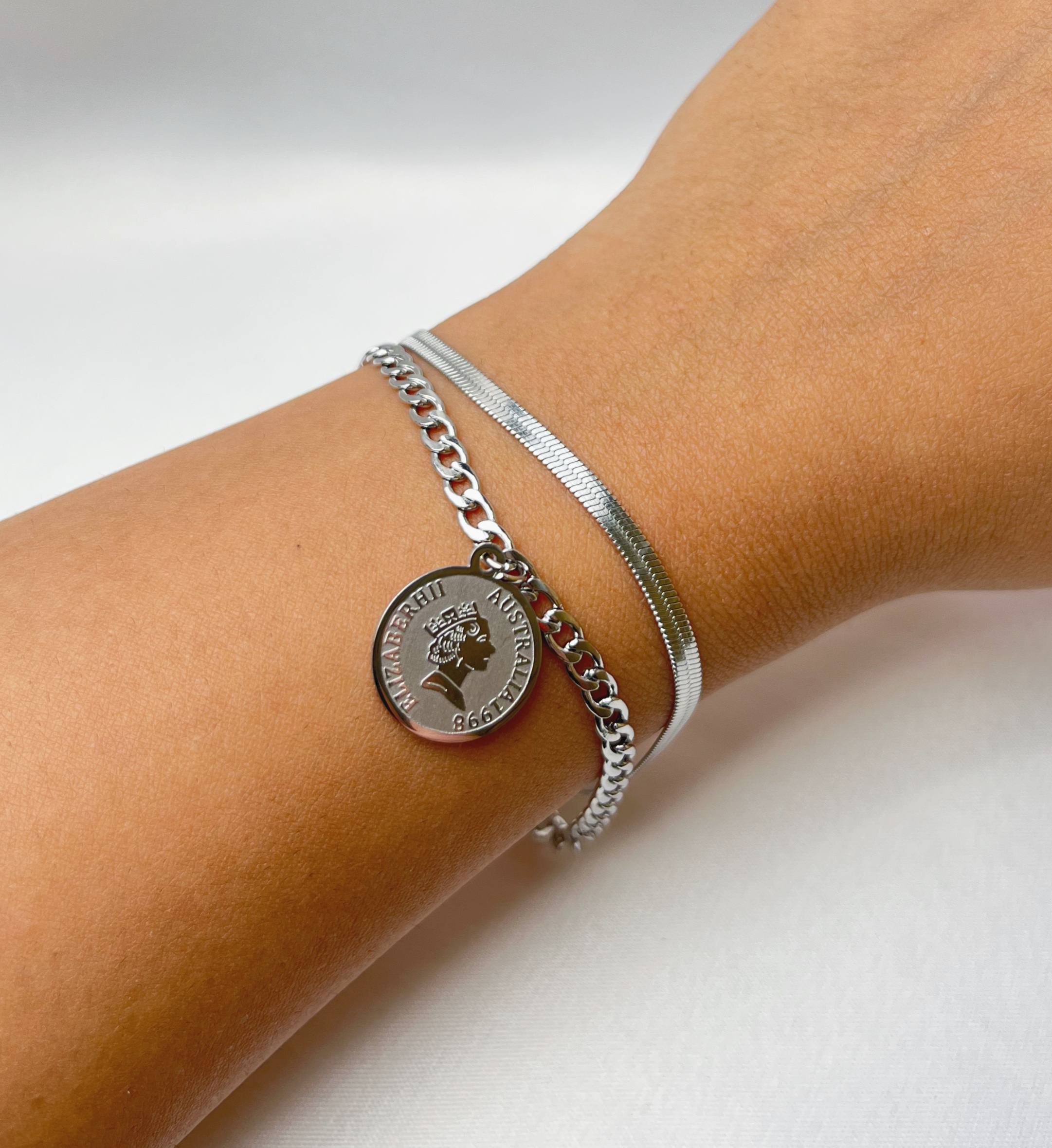 دستبند دولاین الیزابت زنانه (طلایی/نقرهای) طرح سکه کد 100